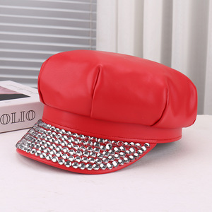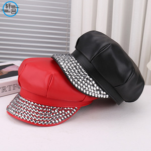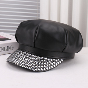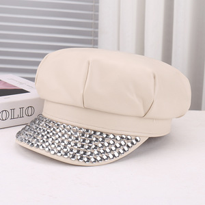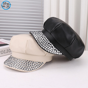 跨境时尚水钻帽檐软pu皮透气鸭舌帽户外旅行气质复古英伦平顶帽