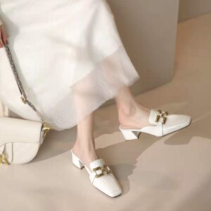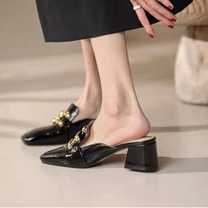 网红包头半拖鞋女夏新款外穿气质漆皮百搭中跟粗跟方头穆勒凉拖鞋