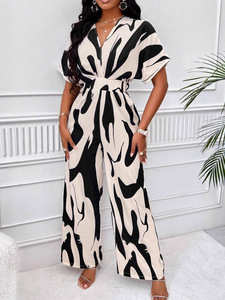 跨境2025亚马逊速卖通欧美春夏新款短袖印花收腰连体裤时尚阔腿女