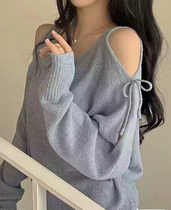 初秋の新しい韓国スタイルの甘いオフショルダー鎖骨レースアップルーズで軽いニット長袖トップ女性用