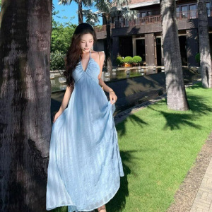 法式气质蓝色挂脖吊带连衣裙女夏季2025新款海边度假露背收腰长裙