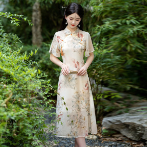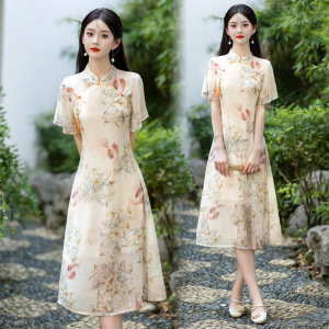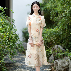 改良版复古A字旗袍裙新中式气质优雅立领盘扣长裙少女国风连衣裙