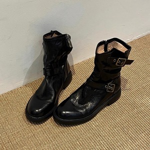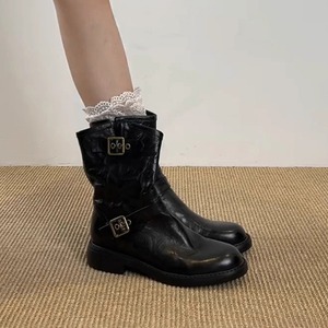 羊皮版~复古水洗百搭马丁靴女皮带扣侧拉链粗跟外穿西部靴子
