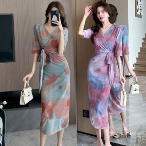 温柔风轻奢女人味五分袖V领彩虹花色显瘦包身修身时尚百搭连衣裙