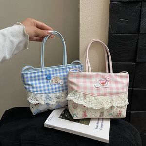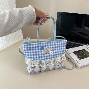 格子手提包夏天新款小清新樱桃上班手拎小包波点蝴蝶结可爱斜挎包