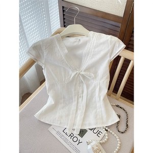 双层/原版绣花布+内里蕾丝花边短袖衬衫女夏甜美蝴蝶结系带上衣