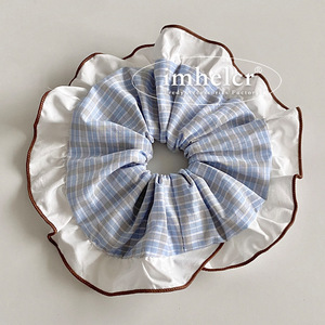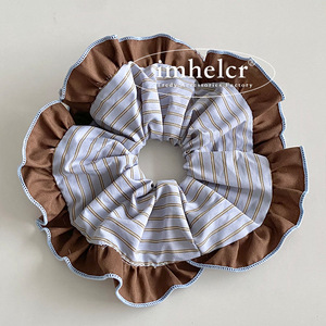 韩系蓝咖条纹撞色花边大肠发圈早秋新款复古时尚大号扎马尾发绳女