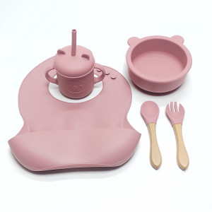 バーガンディ (リトルベアシリコンボウル + スタイ + カップ + 木製ハンドル + スプーン + フォーク)