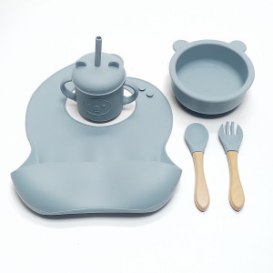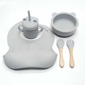 シルバーグレー (リトルベアシリコンボウル+よだれかけ+カップ+木製ハンドル+スプーン+フォーク)