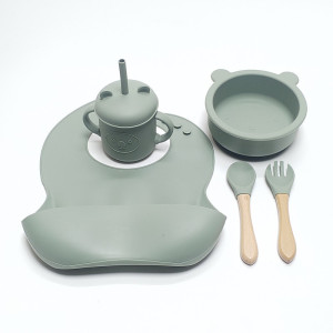 オリーブグリーン (リトルベアシリコンボウル+よだれかけ+カップ+木製ハンドル+スプーン+フォーク)