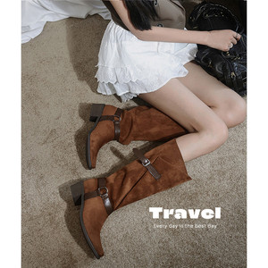 韩国ins绒面小个子高筒靴2025秋冬新款不过膝粗跟皮带扣骑士长靴