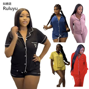 亚马逊跨境欧美家居服套装开衫短袖衬衣短裤睡衣女欧美风家居服