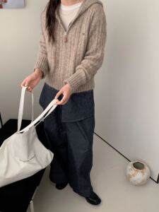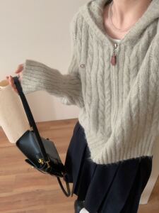 韩系穿搭连帽灰色针织开衫女慵懒高级感春秋宽松显瘦毛衣外套上衣