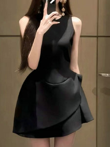 エレガントでハイエンドのリトルブラックドレス、スリムフィット、ニッチデザイン、花のつぼみのショートスカート、女性用のファッショナブルな新しいドレス