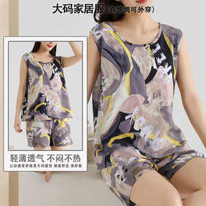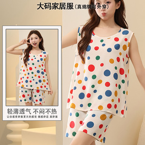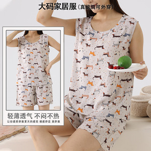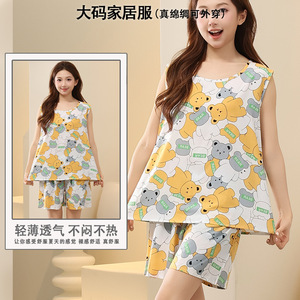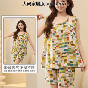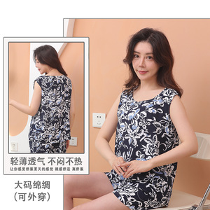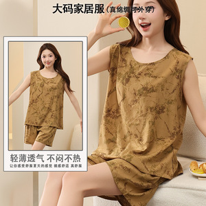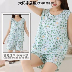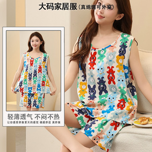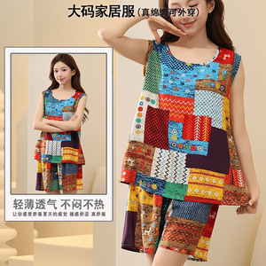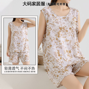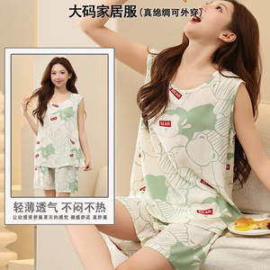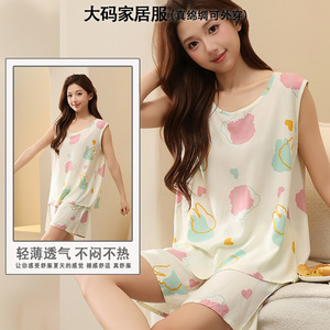 綿シルクパジャマ女性の夏の薄いノースリーブベストショーツツーピーススーツ大きいサイズルーズ人工綿ホーム服