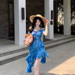 法式气质海边度假连衣裙子女夏2025新款蓝色碎花不规则设计感长裙
