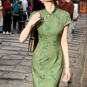 2025年 丹青绿色新中式碎花改良旗袍女夏2025新款小个子连衣裙