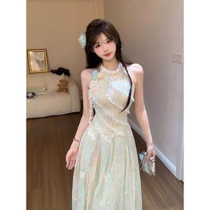 法式甜美绿色无袖不规则蕾丝挂脖式花朵连衣裙女夏新款氛围感长裙