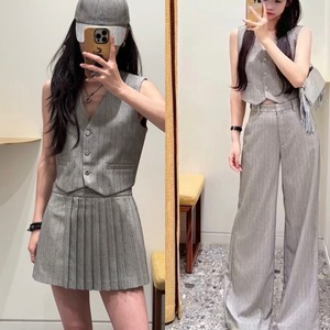 法式优雅2025早秋气质条纹烫钻无袖V领马甲+百褶裤裙+直筒裤套装