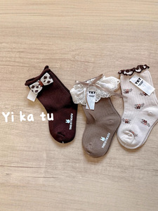 Yikatu伊卡兔儿童袜子批发2025秋款新款咖色小花花边童袜