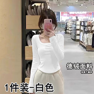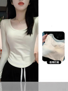 弧形下摆正肩长袖T恤女早秋方领修身显瘦短款春秋打底衫内搭上衣