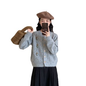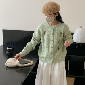 秋冬新款宽松软糯圆领针织开衫韩系温柔风复古刺绣毛衣外套女上衣