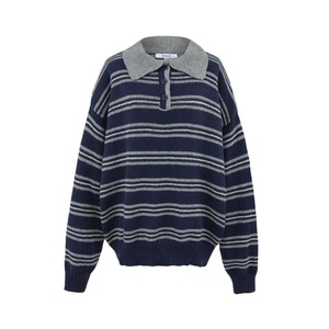 秋冬欧美风条纹polo领毛衣针织衫女时尚休闲慵懒长袖套头上衣女