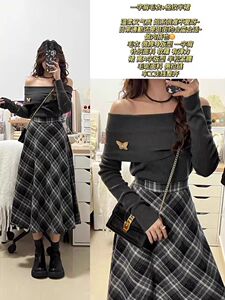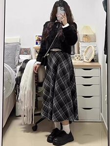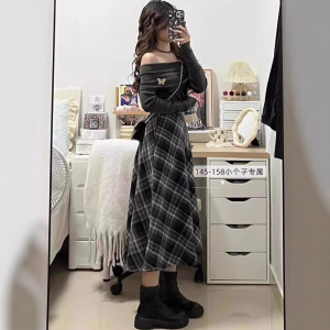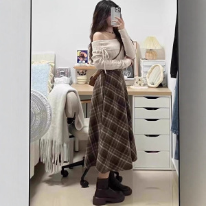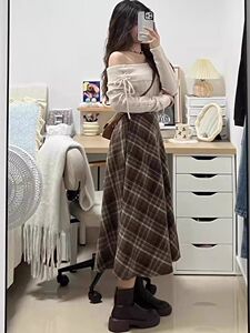 毛呢格子半身裙女秋冬小个子2025新款松紧腰卡其色中长款a字伞裙