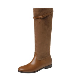 低跟长筒靴女2025秋冬新款磨砂骑士靴拼接翻毛皮靴子平底加绒长靴