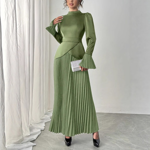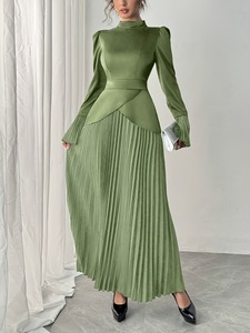 TEMU独立站外贸宫廷风高领收腰百褶长袖气质晚宴年会礼服连衣裙