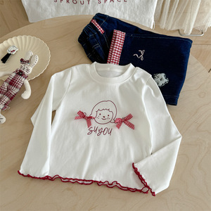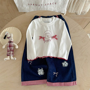 クリームガールズ子供服秋の新作子供韓国風リボンベビードールシャツボトリングシャツ+ジーンズ2点セット