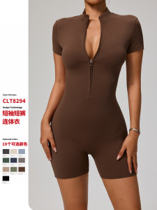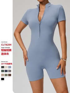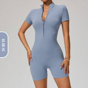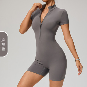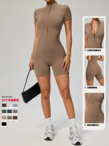 添亿欧美夏季拉链短袖瑜伽连体服女舞蹈健身紧身短裤运动连体衣