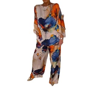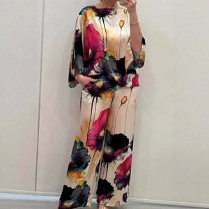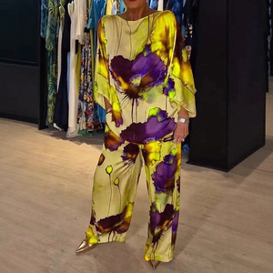 2025夏秋新品独立站-都市优雅破卡一字领宽松印花蝙蝠袖长裤套装