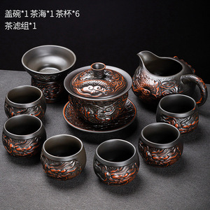 大号黑檀色江山盘+紫陶双龙戏珠茶壶盖碗六君子14入