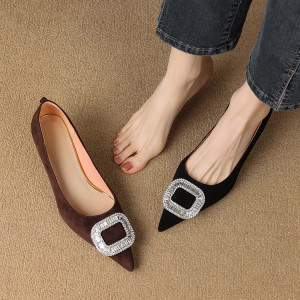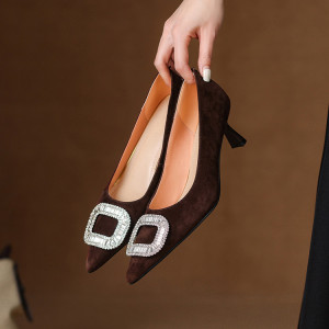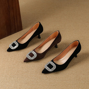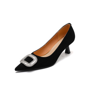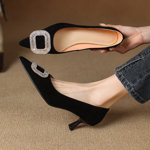韩版时装气质水钻方扣羊反皮高跟鞋尖头浅口细跟中跟单鞋女