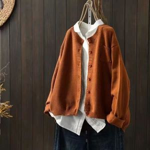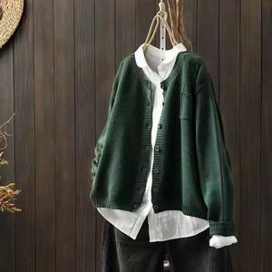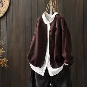 秋季新款 长袖针织开衫棉线口袋复古宽松纯色休闲百搭上衣1681