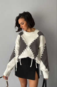 2025跨境春季新款圆领长袖撞色菱格设计感穿绳绑带针织套头衫毛衣