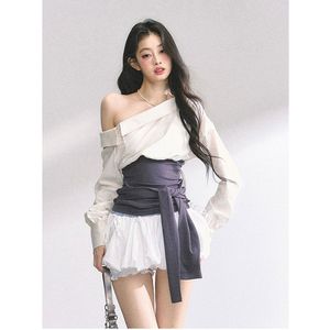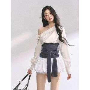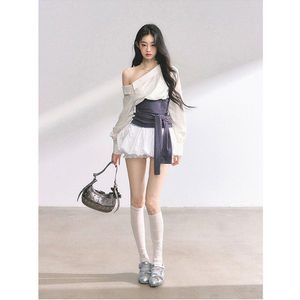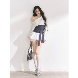 法式甜美斜肩辣妹长袖T恤上衣女夏季新款收腰显瘦设计感花苞裙裤