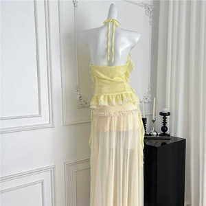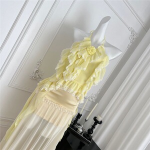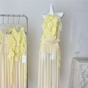 多巴胺荷叶边吊带挂脖辣妹玫瑰半身裙甜辣夏季连衣裙两件套装