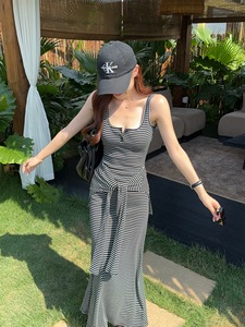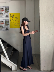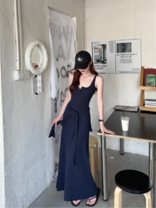 藏蓝色吊带裙小众带胸垫连衣裙女夏季气质收腰显瘦长裙辣妹包臀裙