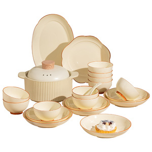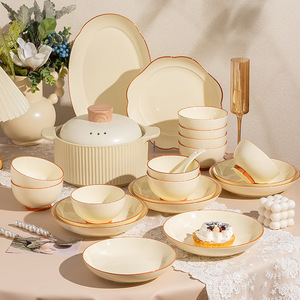 奶油色碗碟家用套装浅咖描边釉下彩碗盘陶瓷盘子饭碗简约汤碗组合