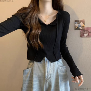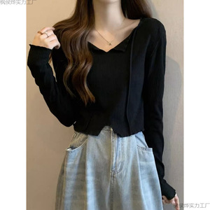 法式锁骨领内搭长袖恤女秋装设计感洋气独特别致小个子短款上衣