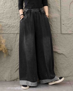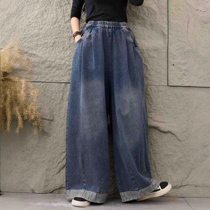 直筒裤女2025秋季新款拼接贴布拉毛宽松高腰松紧阔腿牛仔裤女