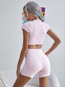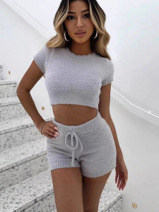2025欧美跨境新款时尚套装女装休闲毛绒针织上衣系带短裤两件套女