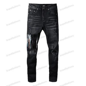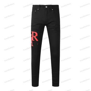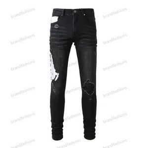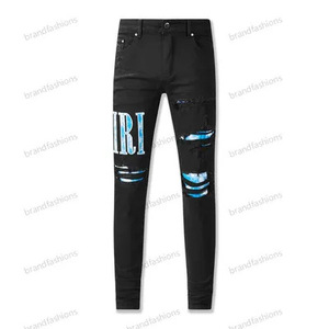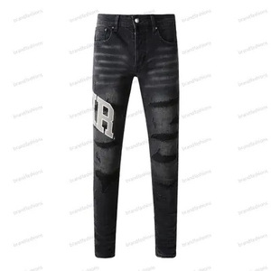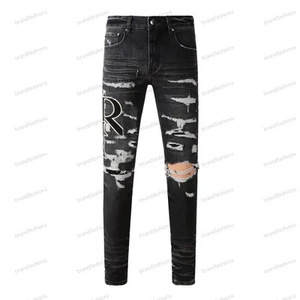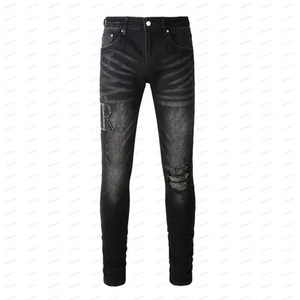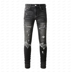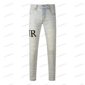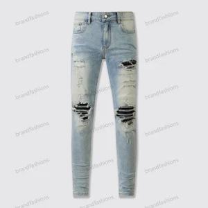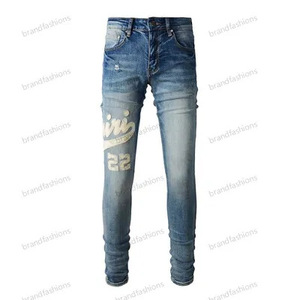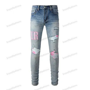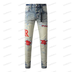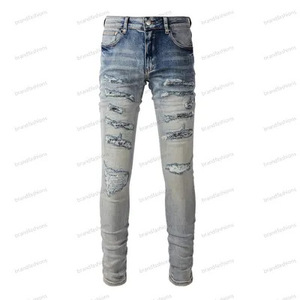 在庫ありハイストリートファッションメンズジーンズヴィンテージライトブルータイトフィットリッピングパッチメンズヒップホップデニムパンツ