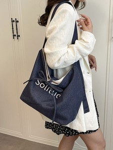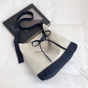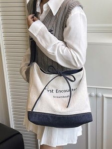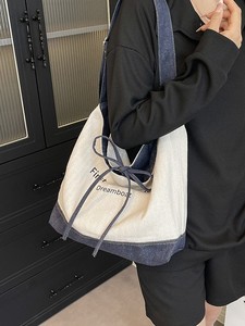 韩版文艺风双面购物袋帆布包包2025新款撞色字母印花蝴蝶结斜挎包