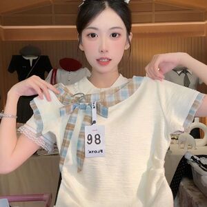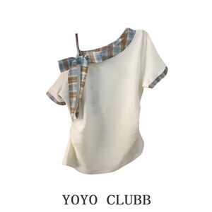 甜辣格纹撞色斜领短袖t恤女夏季复古蝴蝶结收腰显瘦褶皱短款上衣