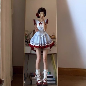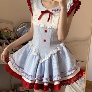 夏季小众可爱甜美风连衣裙女收腰显瘦拼接花边小飞袖蝴蝶结短款裙