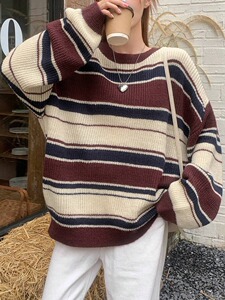 欧美跨境高街条纹毛衣女冬季复古休闲拼色圆领套头学生宽松针织衫