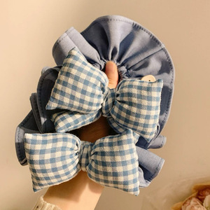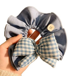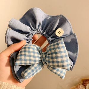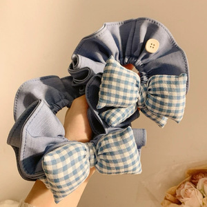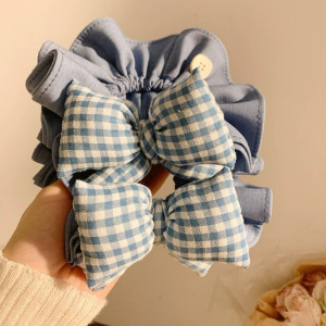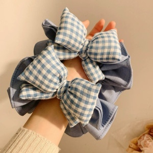 蓝色格子蝴蝶结大肠发圈女高级感~大号头绳韩系慵懒风丸子头发饰